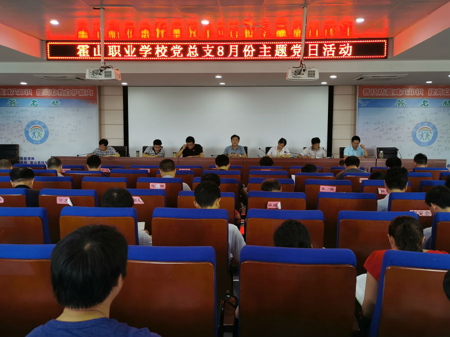 8月18日下午,中共霍山职业学校总支在明德楼六楼报告厅举行八月份主题党日活动。校总支书记、校长王荣飞主持会议,全体党员、入党积极分子参加了会议。