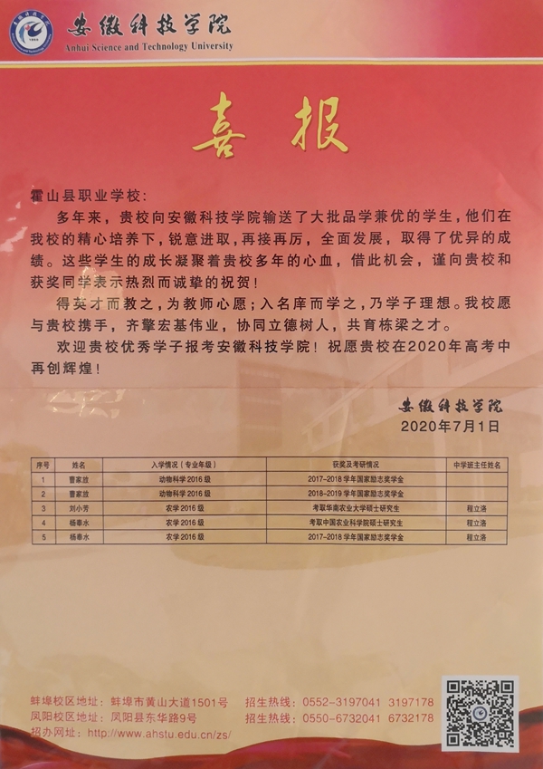 霍山职业学校三名毕业生在安徽科技学院本科学习中取得优异成绩,学院再次发来了喜报。