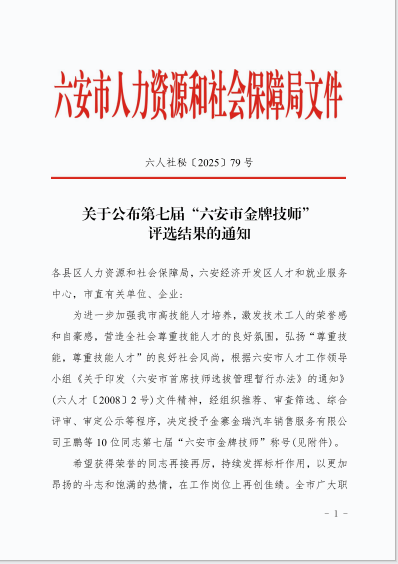 从六安市人力资源和社会保障局(六人社秘〔2025〕79号)《关于第七届“六安市金牌技师”评选结果的通知》文件获悉:为进一步加强六安市高技能人才培养,激发技术工人的荣誉感和自豪感,营造全社会尊重技能人才的良好氛围,弘扬“尊重技能,尊重技能人才”的良好社会风尚,根据六安市人才工作领导小组《关于印发《六安市首席技师选拔管理暂行办法》的通知(六人才〔2008〕2号)文件精神,经组织推荐、审查筛选、综合评审、审定公示等程序,霍山职业学校教师张为兵同志喜获第七届“六安市金牌技师”称号。