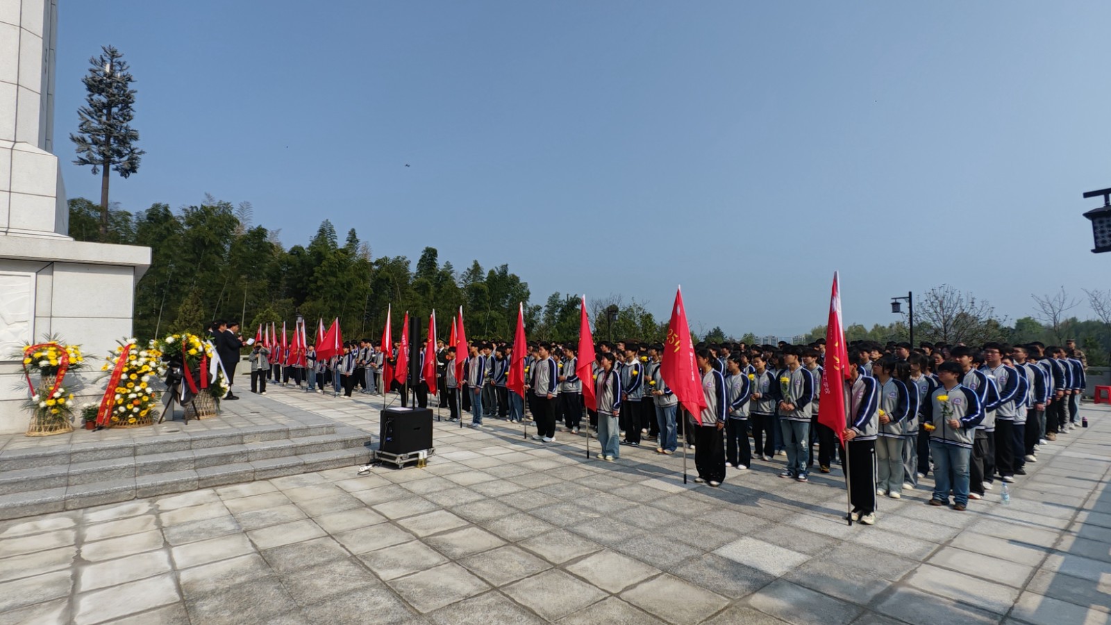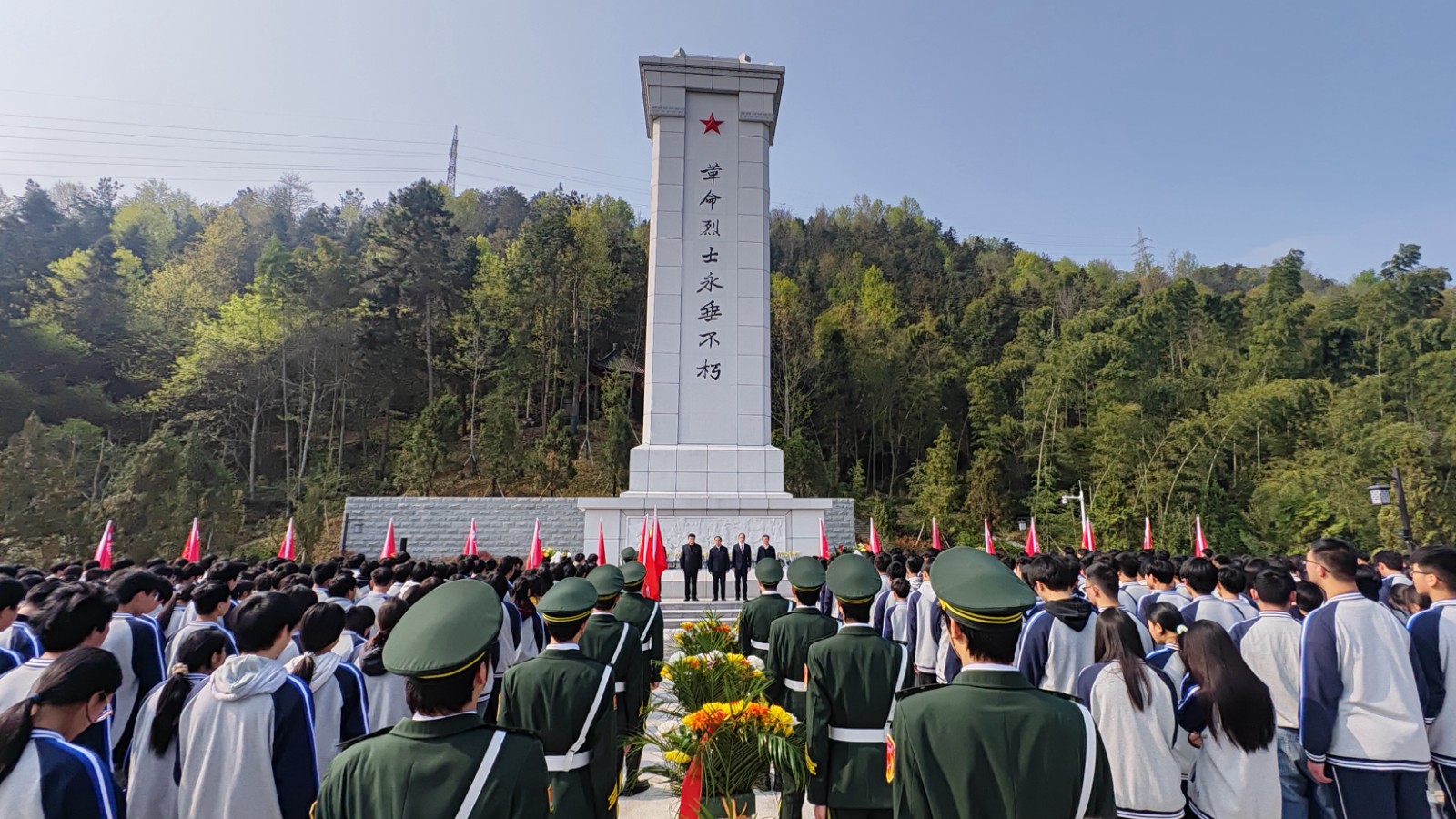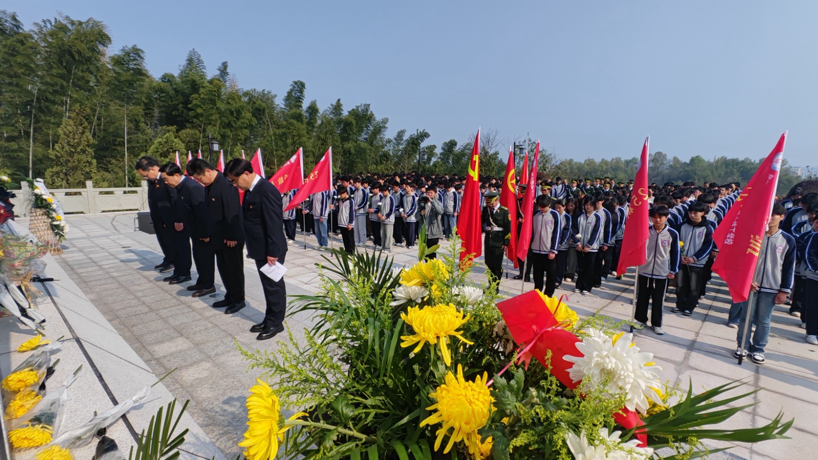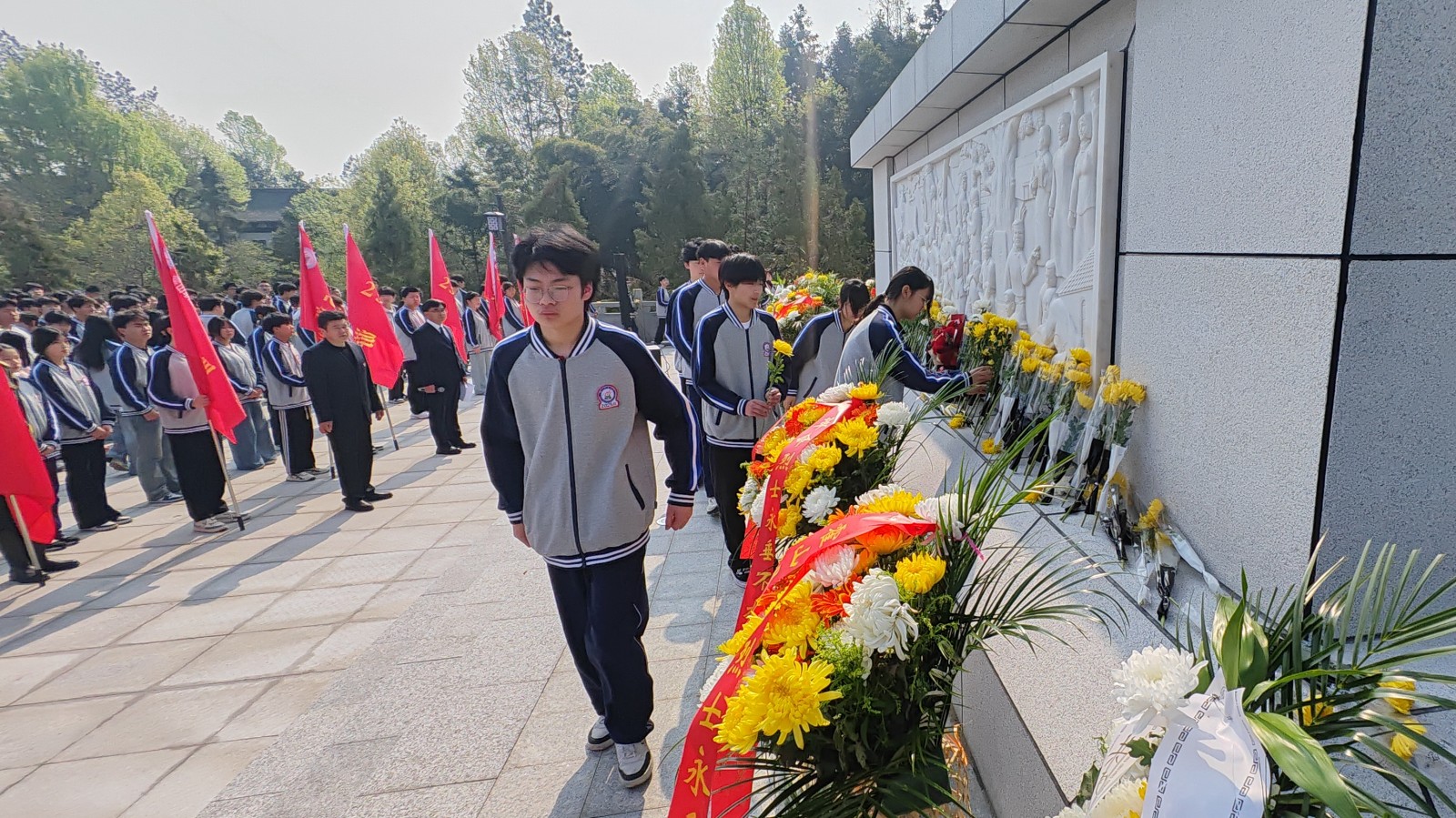 上午9:20,烈士陵园松柏凝翠,丰碑巍峨。活动在雄壮的《中华人民共和国国歌》声中拉开序幕。全体人员面向革命烈士纪念碑默哀一分钟,向为民族独立、人民解放和国家富强英勇献身的先烈致以深切哀思。国旗护卫队步伐铿锵,向纪念碑敬献花篮,县关工委主任邵必贵与校领导上前仔细整理缎带。随后,各班级学生代表依次敬献鲜花,以朴素而庄重的方式表达对先烈的无限追忆。