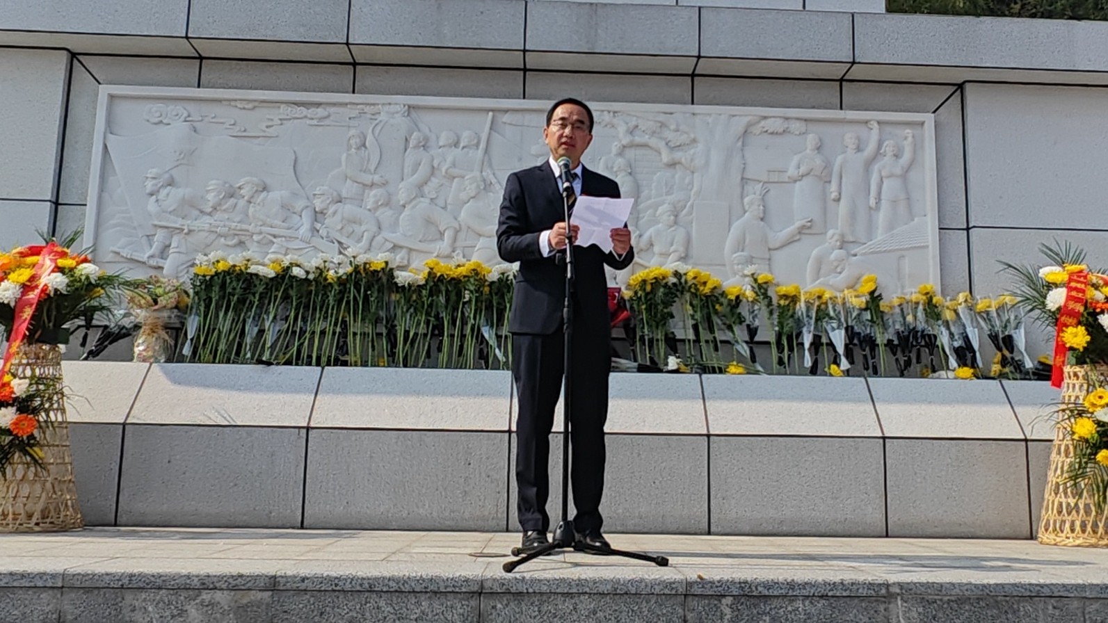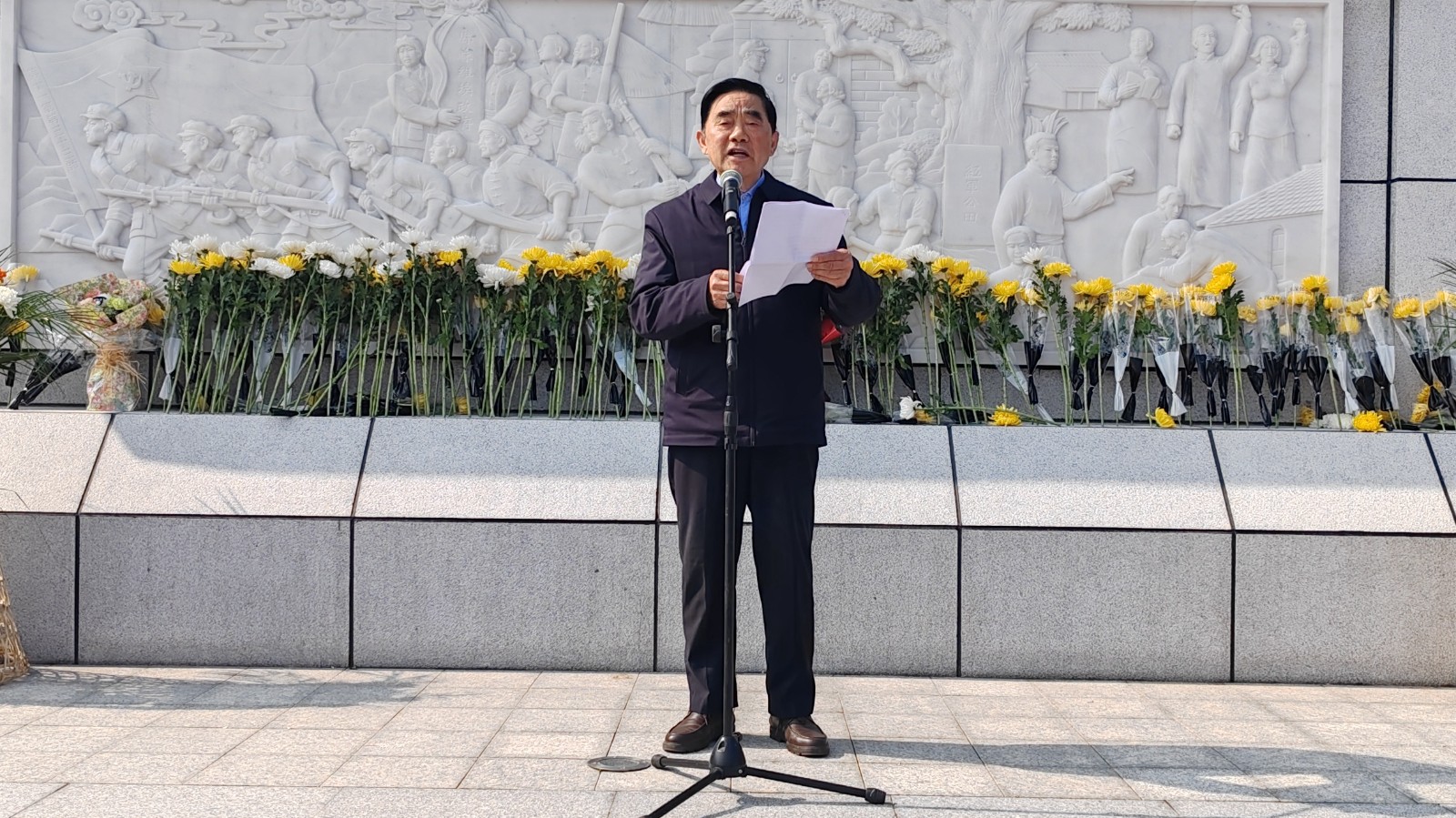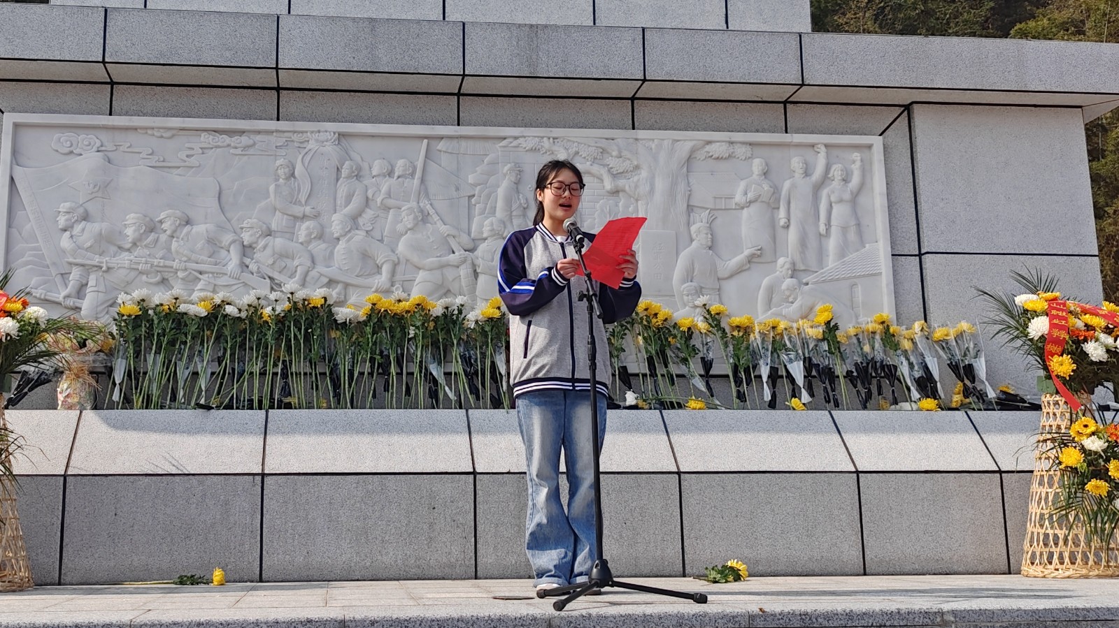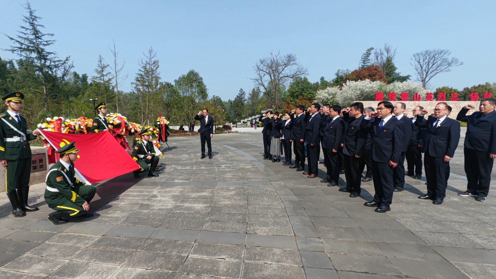 上午9:20,烈士陵园松柏凝翠,丰碑巍峨。活动在雄壮的《中华人民共和国国歌》声中拉开序幕。全体人员面向革命烈士纪念碑默哀一分钟,向为民族独立、人民解放和国家富强英勇献身的先烈致以深切哀思。国旗护卫队步伐铿锵,向纪念碑敬献花篮,县关工委主任邵必贵与校领导上前仔细整理缎带。随后,各班级学生代表依次敬献鲜花,以朴素而庄重的方式表达对先烈的无限追忆。