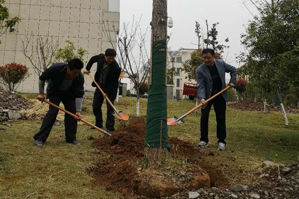 3月22日,学校党员开展植树绿化活动。在校园植树点,参加植树的党员们,扶正树木、挥锹培土、提桶浇水,认真完成每一道工序,亲手栽下自己的“初心”纪念树并合影留念。