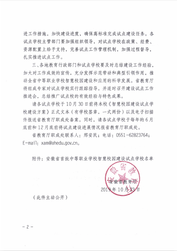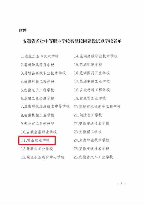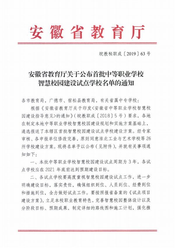 获得安徽省首批中等职业学校智慧校园建设试点的学校全省共有26家单位。根据文件精神,本批中等职业学校智慧校园建设试点周期为3年,各试
