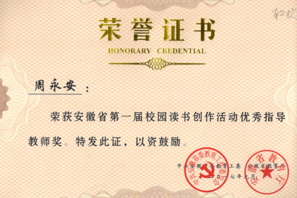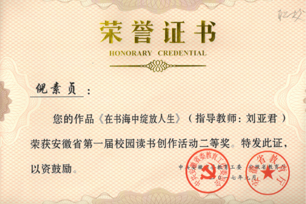 安徽省第一届校园读书创作活动由省委教育工委、省教育厅会同省文化厅、省新闻出版广电局、团省委主办,安徽大学、安徽新华发行集团协办,安徽省教育宣传中心承办。全省共有300余万人参与,分小学、初中、高中、中职、大学和教师六组,作品共8500余篇。经层层评选,最终共评选出特等奖30名、一等奖300名、二等奖600名、三等奖900名、优秀奖1007名和优秀指导教师奖30名。