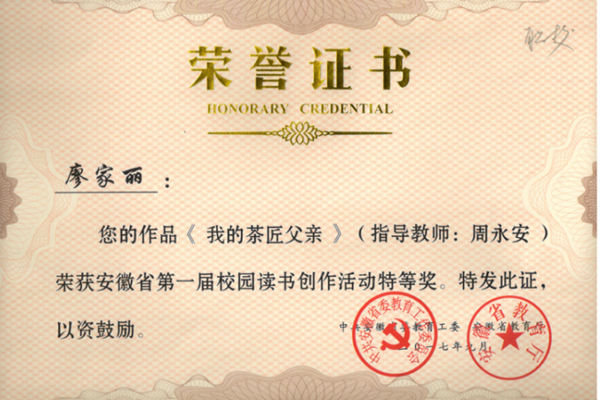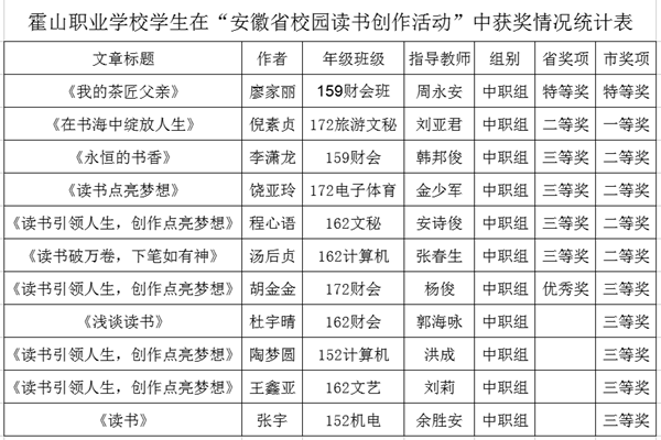 10月27日,霍山县教育局公布了各校在安徽省第一届校园读书创作活动中的获奖结果,霍山职业学校成绩显著,共有十一件作品获市级奖项,七件作品获省级奖项,其中,159财会班廖家丽的《我的茶匠父亲》在全省8500多件作品中脱颖而出,参与了近90人的省电视台现场特等奖的角逐,并最终荣获省级特等奖,也是霍山县及六安市的唯一一个特等奖。