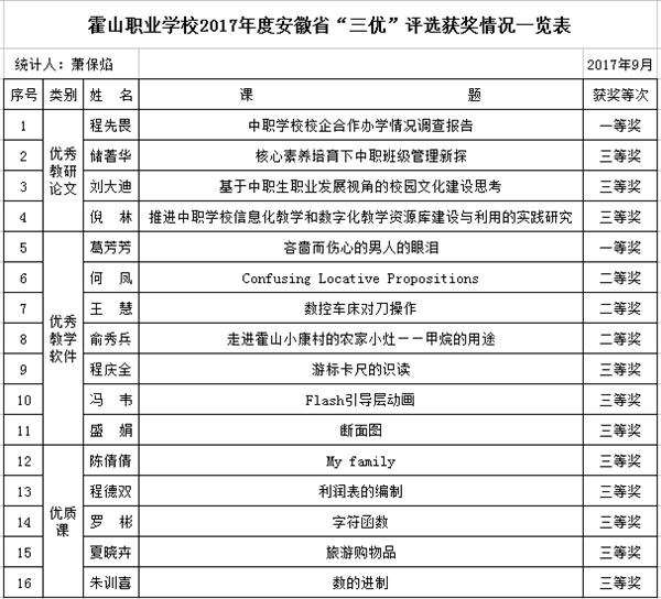 霍山职业学校在2017年中等职业学校“三优”评选活动中,经市级专家评审,有51件(篇)作品获奖,其中优秀教研论文27篇,优质教学软件16件,优质课8件。在市级获奖的作品,报送省级评选后,成绩依然喜人。共有16件(篇)作品获奖,其中优秀教研论文4篇,优质教学软件7件,优质课5件。其中,一等奖2个,二等奖3个。
