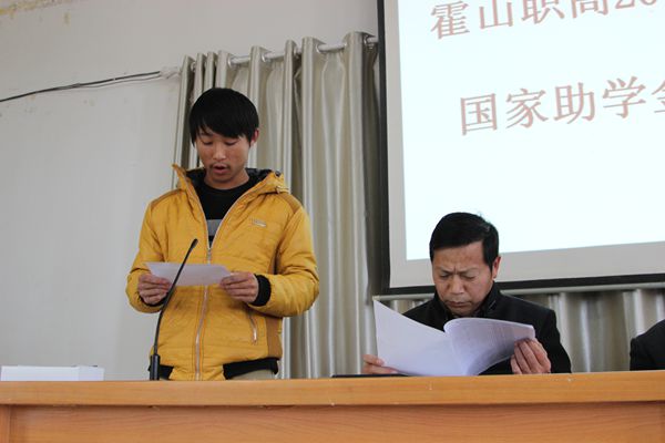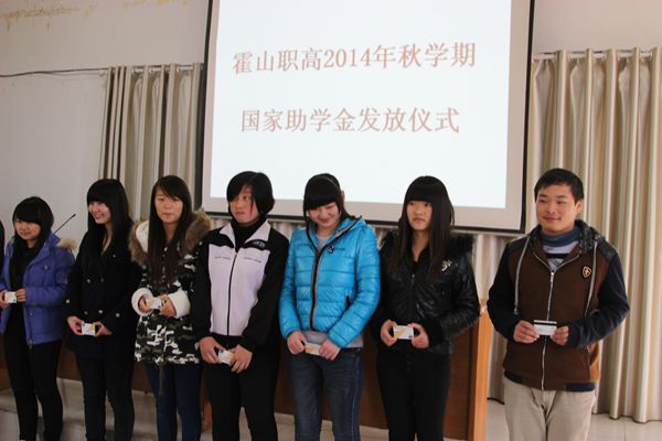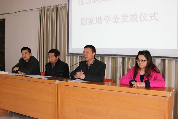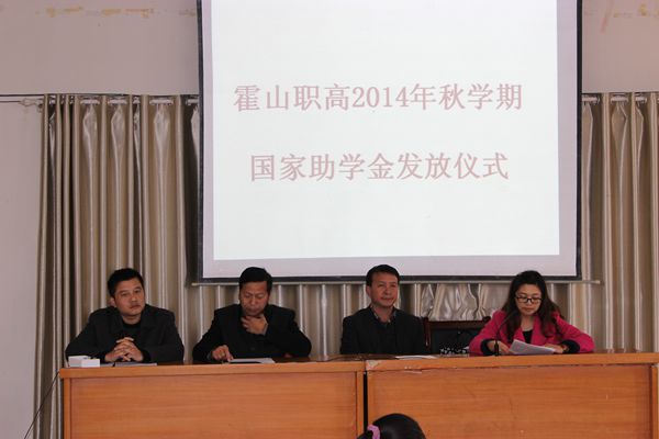 11月28日下午,霍山职高在阶梯教室举行2014年秋学期中职国家助学金发放仪式。分管校长郭忠平、政教处主任潘长青、资助办主任洪成、会计梁娟,以及331名受资助的中职学生参加了发放仪式。霍山职高国家助学金发放仪式由洪成同志主持。