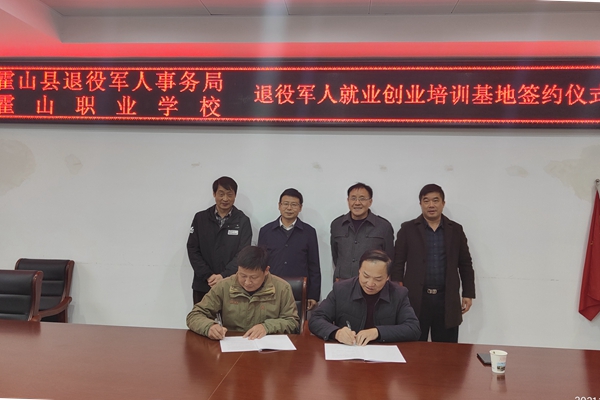 12月7日,霍山县退役军人就业创业培训基地在霍山职业学校正式挂牌成立,霍山县退役军人事务局局长陈昌启,霍山职业学校校长王荣飞等领导共同为培训基地揭牌,双方代表在学校明德楼三楼会议室还签订了霍山县退役军人就业创业培训基地建设协议,并进行了合影留念。