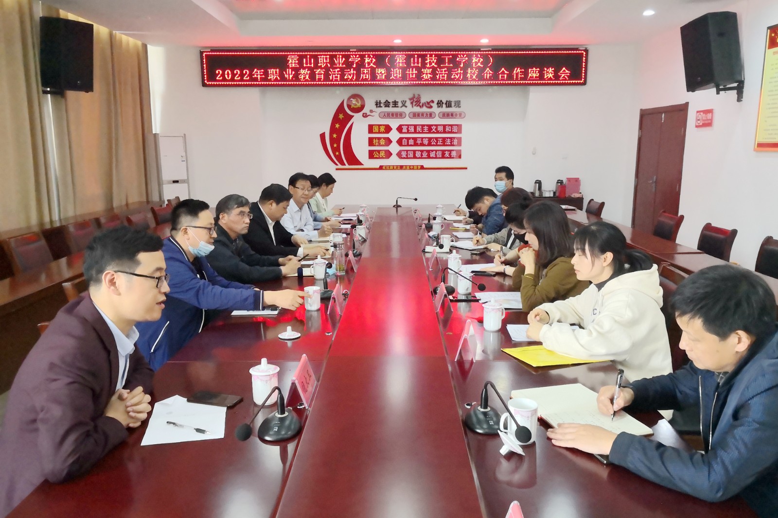 紧接着,县领导和企业代表一起在学校明德楼一楼会议室还召开了“校企合作,产教融合”深度协商对接会。大家就冠名班开设、新型学徒制培养、课程建设、招生就业等进行了深度对接。