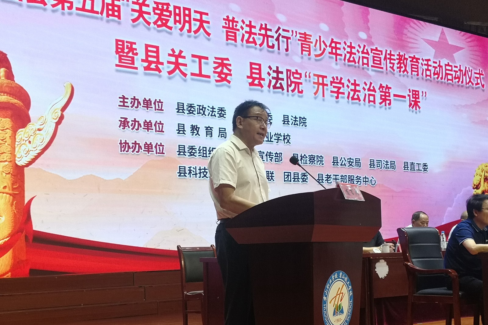 9月20日下午,霍山县第五届“关爱明天、普法先行”青少年法治宣传教育启动仪式暨县关工委、县法院“开学法治第一课”在霍山职业学校知行楼报告厅举行。本次活动由县委政法委、县关工委、县法院主办,县委组织部、县委宣传部、县检察院、县公安局、县司法局、县直工委、县科技经信局、县妇联、团县委、县老干部服务中心协办,县教育局、霍山职业学校承办。相关单位领导、部分中小学校长、职业学校2022级全体学生参加了活动。