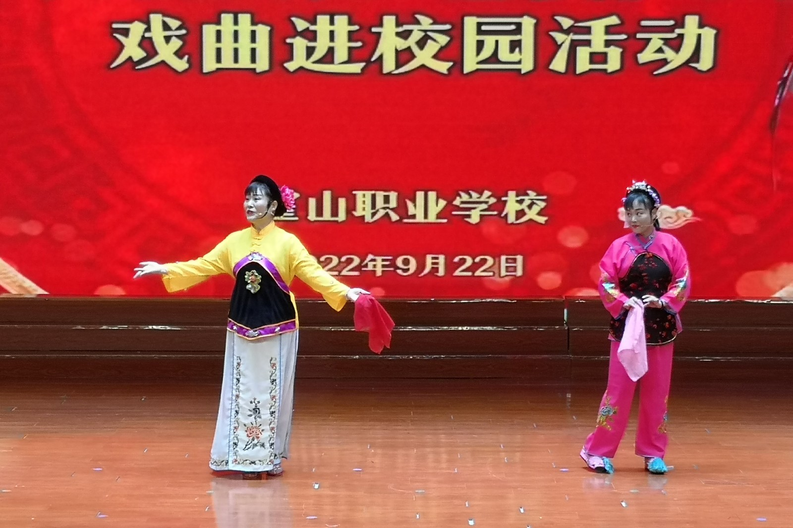 9月22日下午,霍山县2022年戏曲进校园活动在霍山职业学校知行楼报告厅举行。本次活动由霍山县教育局志愿服务大队主办,霍山县凤舞文化传媒和霍山县庐剧协会承办。学校各年级文艺专业的全体学生和部分教师参加了活动。