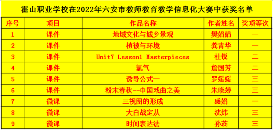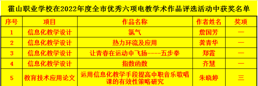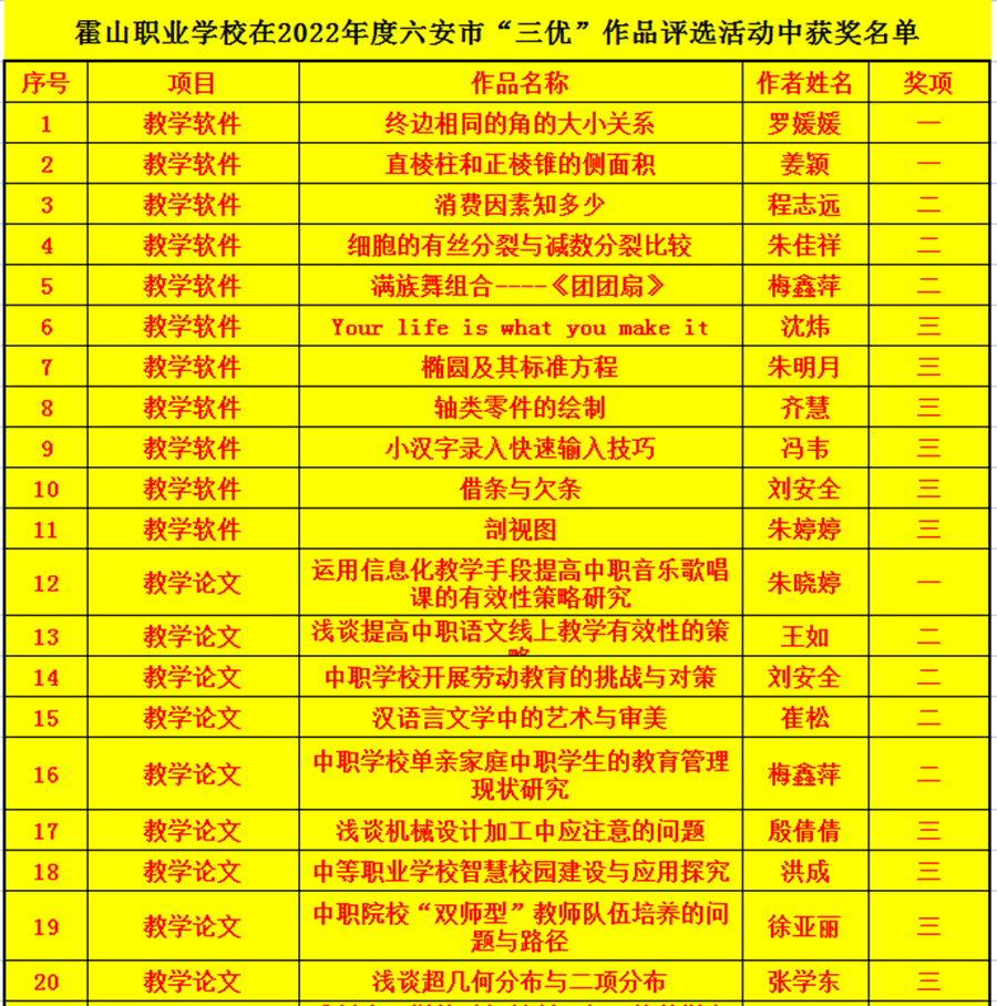 从六安市各类教科研项目陆续公布的文件获悉,霍山职业学校教师2022年度在多个教科研项目评比中均获得了较好成绩。