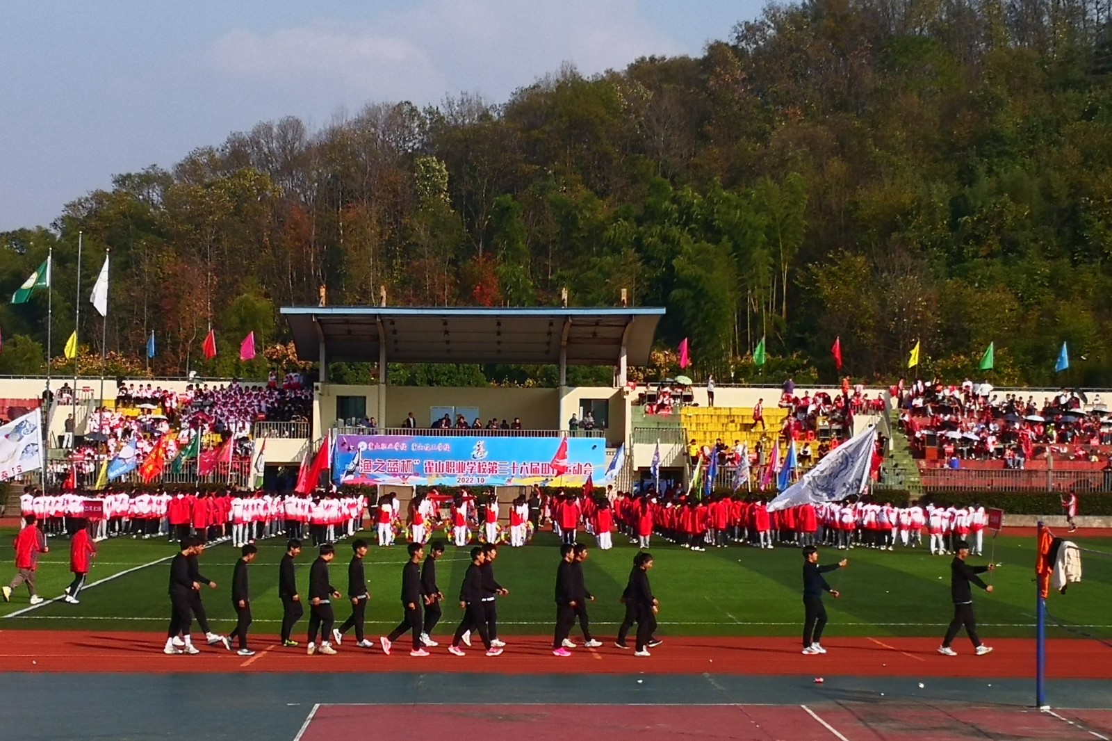 2:20 ,全体起立,升国旗、奏国歌;校党总支副书记副校长何祥庆(主持全面工作)致开幕词;本届运动会总裁判长、副校长倪林宣读《大会须知》及《竞赛规程》 ;运动员和裁判员代表进行了宣誓;最后,刘守忠同志宣布:“渔之蓝杯”霍山职业学校第36届田径运动会开幕!