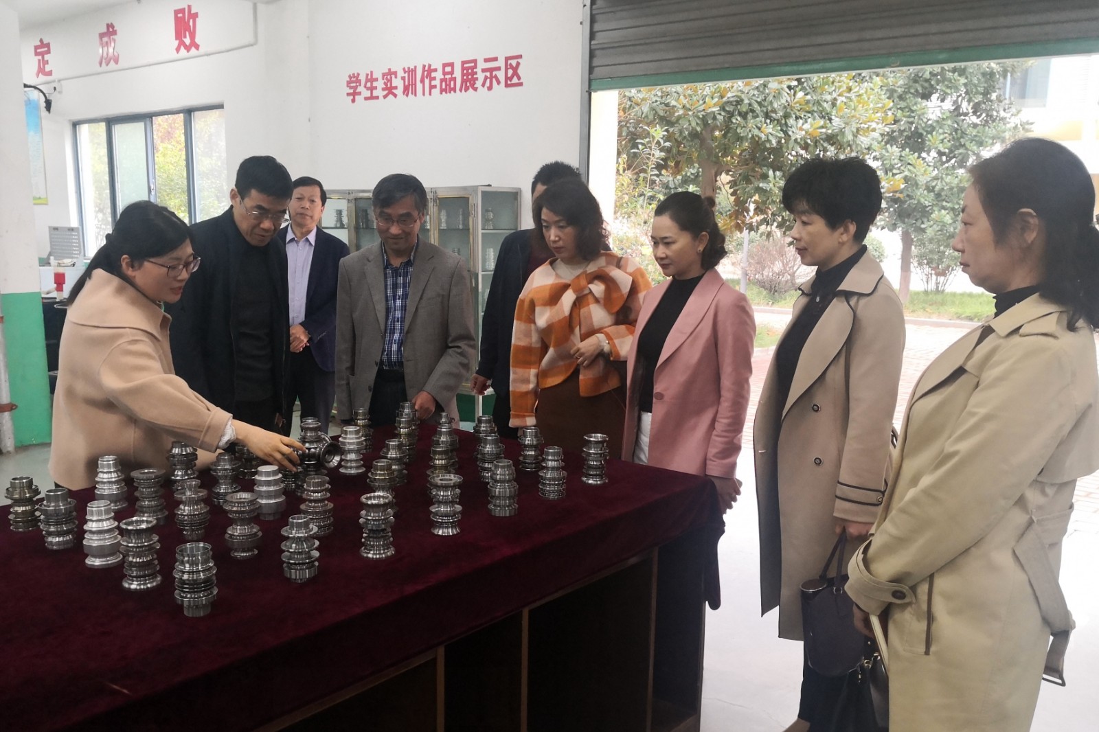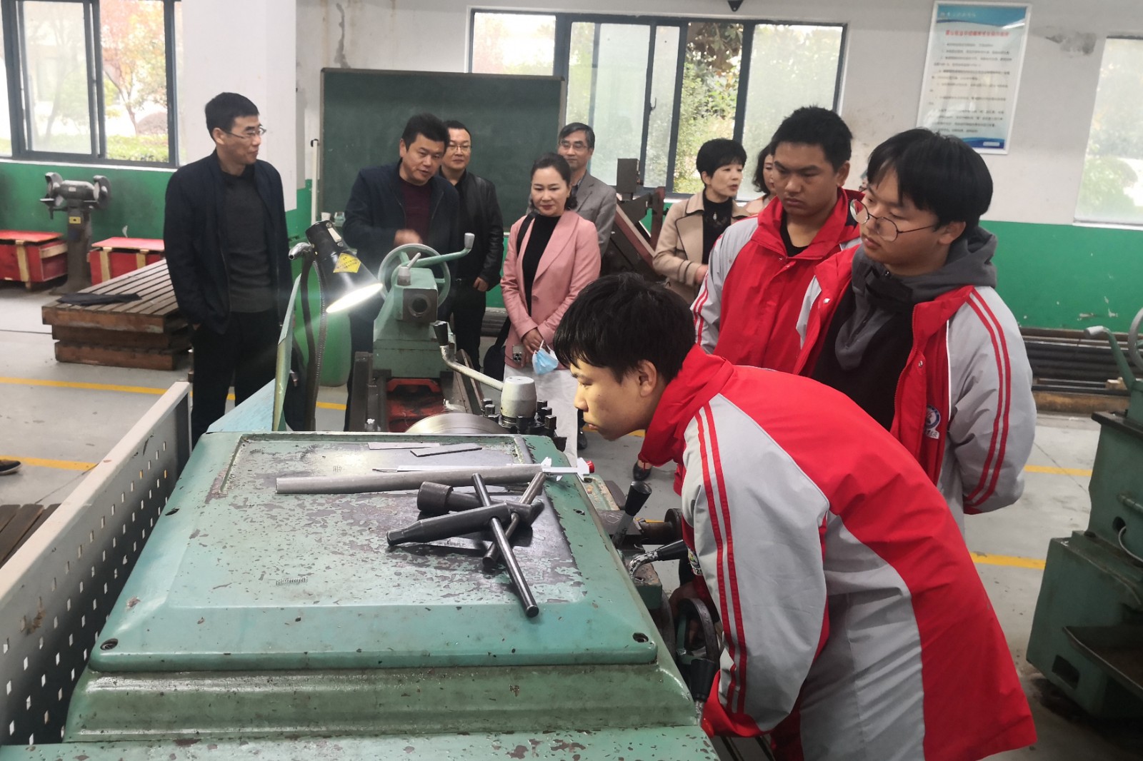 调研组一行在校领导的陪同下,先后参观了学校的阳光温室玻璃大棚、校企合作工厂、数控车间、机器人车间、普车车间等学生实习实训场所。
