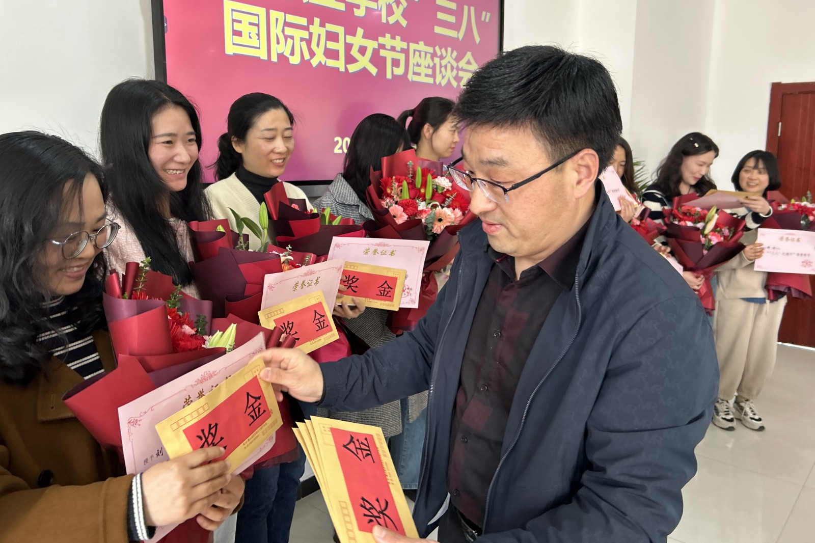 副校长倪林同志宣读表彰决定,高度赞扬全校女教职工拼搏奋进、辛勤耕耘的奉献精神;与会校领导为获得“‘三八’红旗手”称号的十四位女同志送上了节日鲜花、荣誉证书和慰问金并合影留念;获奖教师代表王如、汪萍发表了热情洋溢的讲话,与会人员备受鼓舞,活动在愉快和谐的氛围中圆满结束。