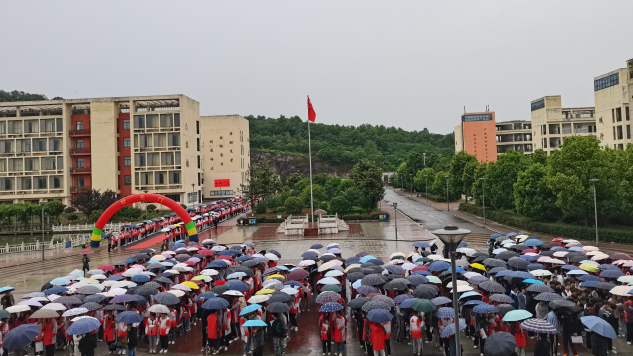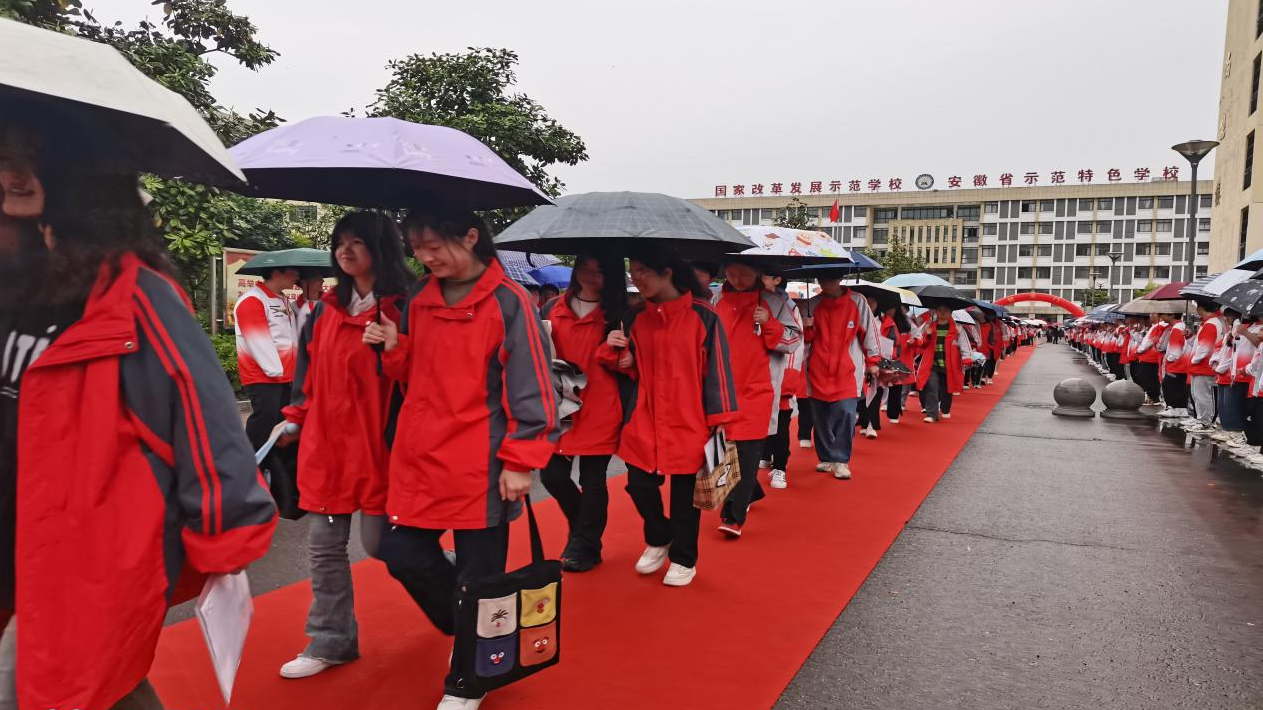 4月22日上午7时许,学校在明德楼前广场为赴考同学举行了简短而热烈的出征仪式。校领导和班主任老师谆谆教导,与他们风雨同行,为他们保驾护航;24届学弟学妹们夹道欢送,与他们携手共进,为他们摇旗呐喊!在一片加油声中,794名考生踏上红地毯,跨过状元门,从容迎战,定当凯旋!