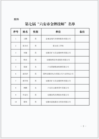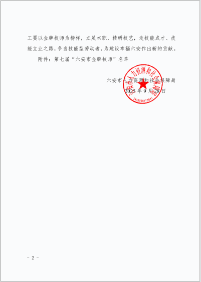 从六安市人力资源和社会保障局(六人社秘〔2025〕79号)《关于第七届“六安市金牌技师”评选结果的通知》文件获悉:为进一步加强六安市高技能人才培养,激发技术工人的荣誉感和自豪感,营造全社会尊重技能人才的良好氛围,弘扬“尊重技能,尊重技能人才”的良好社会风尚,根据六安市人才工作领导小组《关于印发《六安市首席技师选拔管理暂行办法》的通知(六人才〔2008〕2号)文件精神,经组织推荐、审查筛选、综合评审、审定公示等程序,霍山职业学校教师张为兵同志喜获第七届“六安市金牌技师”称号。